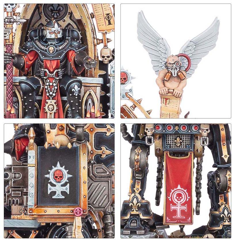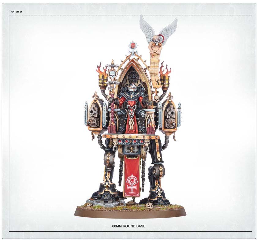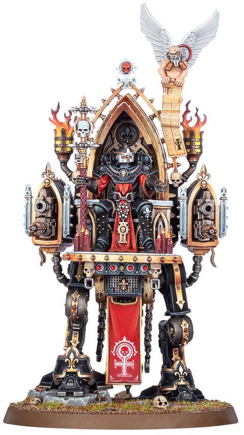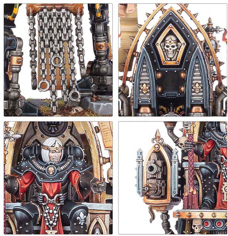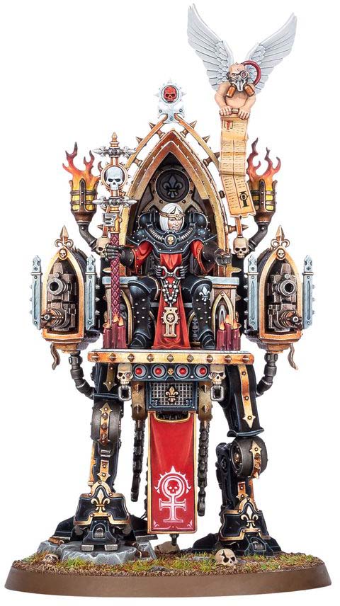 Targets she singles out become immediate priorities – her presence sharpens discipline and focuses the entire force’s firepower. Armed with systems such as heavy bolters, heavy flamers, and a melta missile array, her walker delivers both sustained fire and devastating close-range attacks. When combat closes, she crushes foes with the Mace of Saint Praxedes.