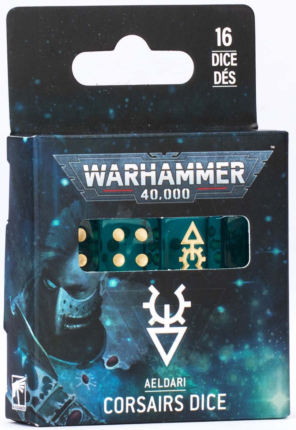This set includes 16 six-sided dice designed for use in games of Warhammer 40,000, themed around the Aeldari Corsairs. The dice are cast in teal gem-effect acrylic plastic with cream-coloured markings.