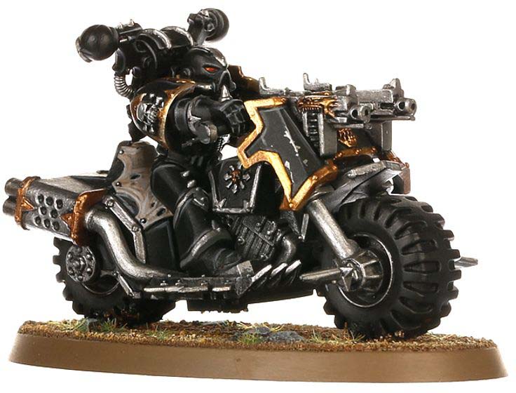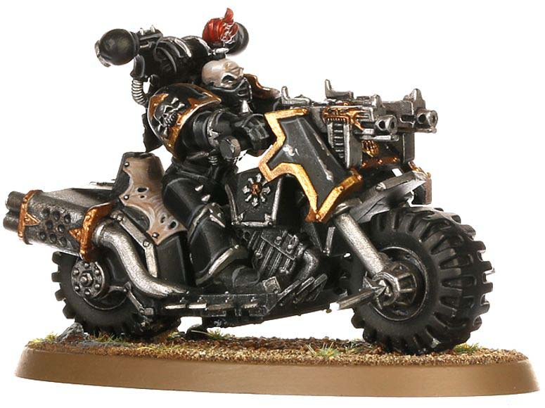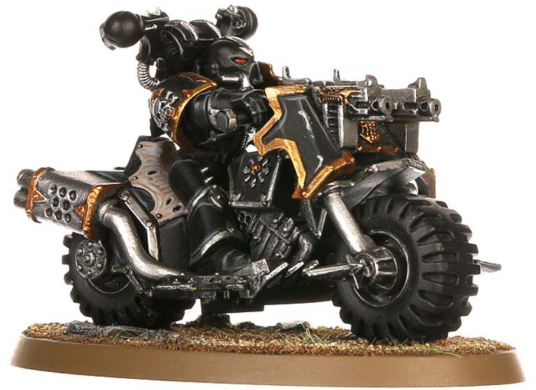 Mounted on roaring war machines, they surge forward with brutal force. Their combi-bolters unleash explosive fire as they smash through enemy lines in violent assaults.