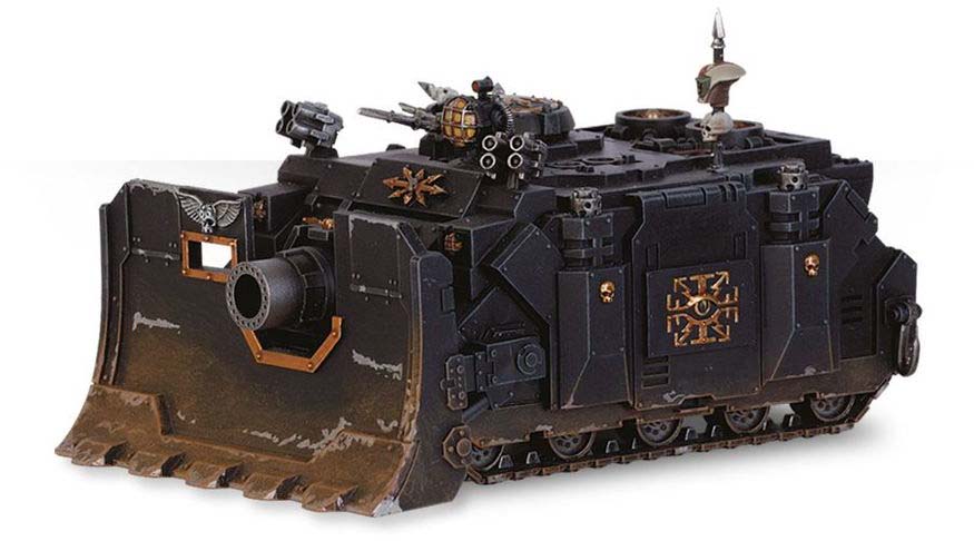 The Chaos Vindicator is a heavily armoured siege tank based on the Rhino Standard Template Construct. The vehicle sacrifices transport capacity in favour of reinforced armour, additional internal bracing, and expanded ammunition storage — all necessary to support the immense firepower of its hull-mounted Demolisher cannon.