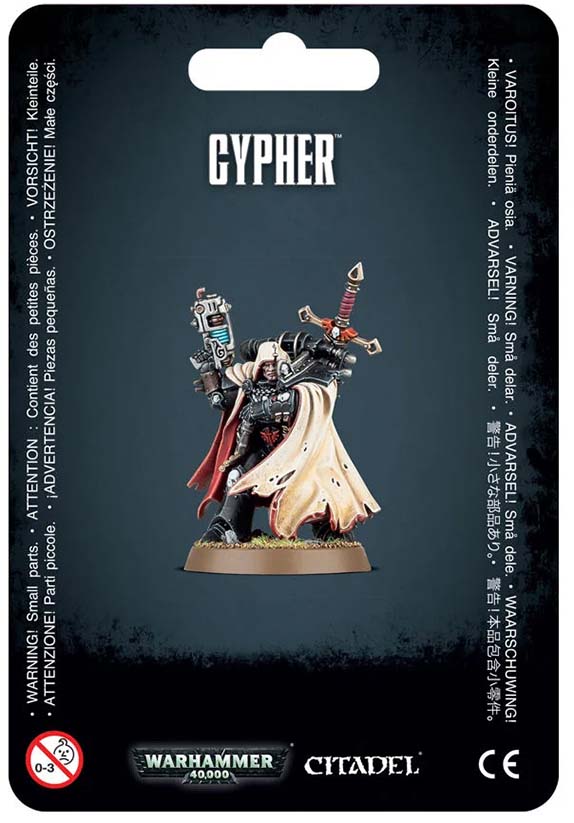 - Cypher in a fixed pose with unique details and wargear