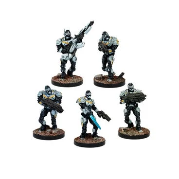 This set contains five premium plastic Enforcer miniatures plus weapons and bases. Including: 5 x Enforcers 4 x Heavy Laser Rifle arms 1 x Assault Blade / Pistol arms 1 x Burst Laser arms 5 x 25mm Mantic bases Models supplied unassembled and unpainted. Sprueless Plastic requires super glue.