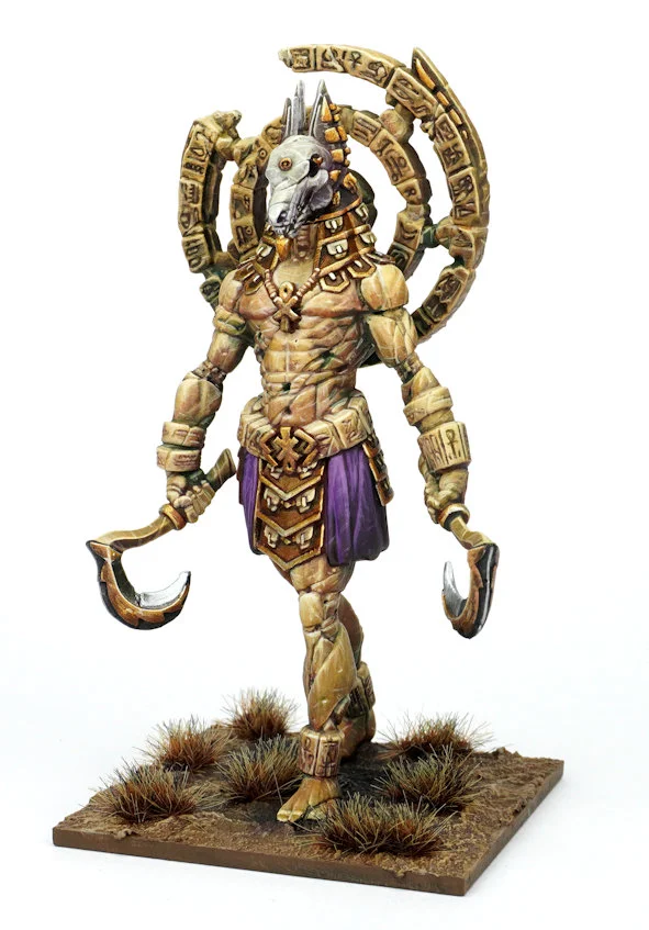 The Ahmunites once worshipped the old god Shobik in their empire and great stone statues of its likeness stand proudly at the entrances to temples, palaces and mausoleums alike, once acting as powerful lodestones for magic and worship. These idols still simmer with innate power and can be summoned to life by high priests chanting blasphemous texts from forbidden scrolls. As literal sandstone giants, these immense beings are not only towering engines of destruction in battle, but they are capable of summoning the blessing of their god to aid the Ahmunites in battle. Contents: 1x Resin EoD Idol of Shobik , 1x MDF 50mm Square Base