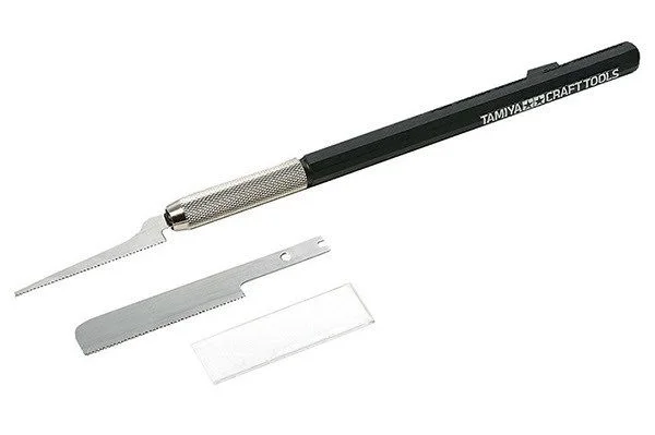 This handy tool is perfect for modifying plastic models or Mini 4WD machines, as well as woodcraft. Its blades are slightly thicker than Item 74018 Mini Razor Saw and therefore less prone to distortion or warping. The item includes 2 blades of different width, and features fine teeth which enable it to cut through a variety of materials while leaving a smooth finish. The 2 blades can be inserted into the included plastic grip, which features the Tamiya logo. Includes wide carbon steel blade x1 and slim carbon steel blade x1 Both blades are of .35mm thickness. Wide blade length: 46mm Slim blade length: 43mm