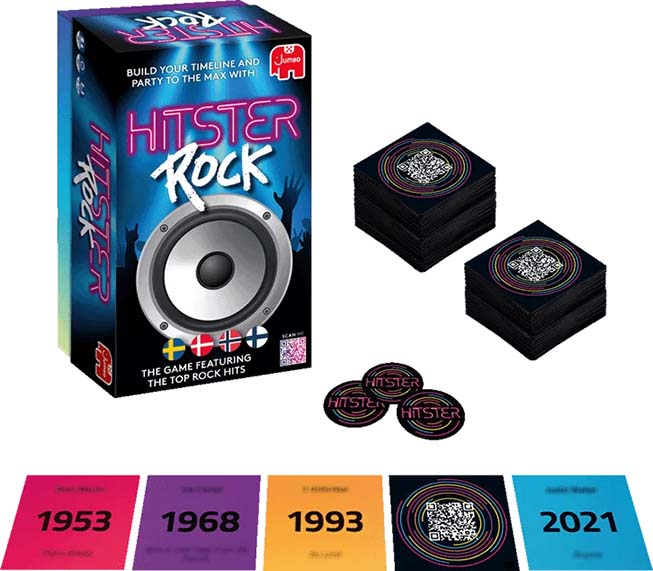 Hitster Rock is a fast-paced music party game where players test their knowledge of more than 70 years of legendary rock hits. Take turns listening to songs and try to place them in the correct order on your timeline.