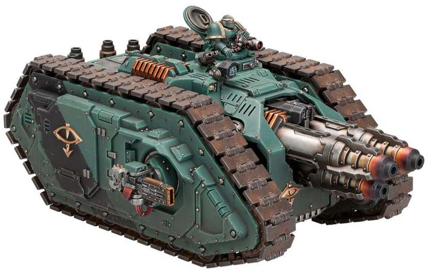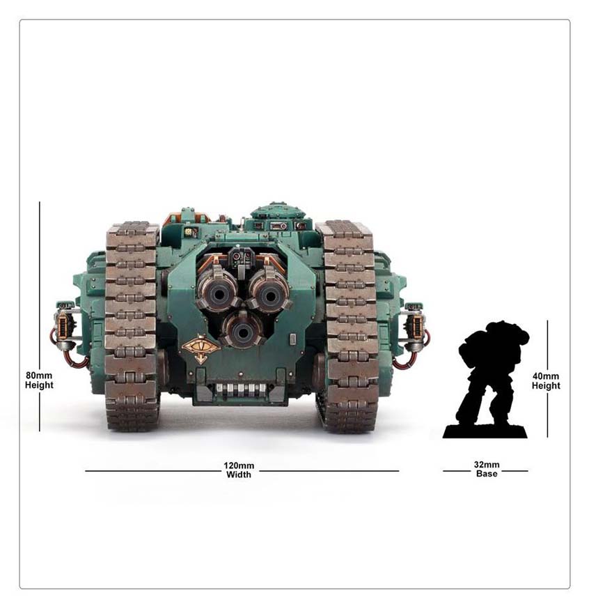 Its sponsons provide additional firepower with options such as heavy bolters, heavy flamers, lascannons, or volkite culverins, allowing it to adapt to a variety of threats.