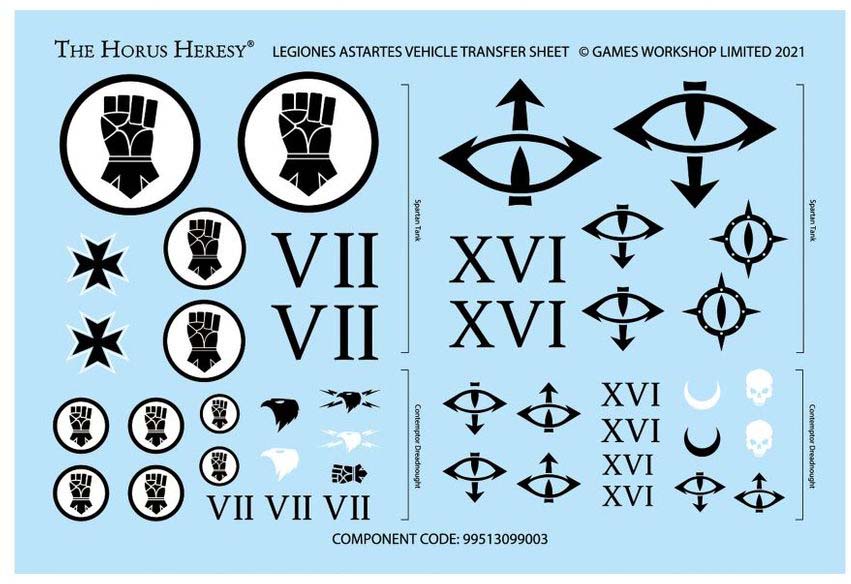 - 1x Legiones Astartes Vehicle transfer sheet (44 transfers)