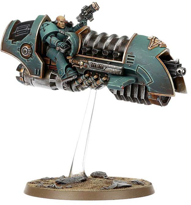Scimitar Jetbikes are feared strike units of the Legiones Astartes, closer in nature to compact aircraft than traditional ground vehicles. Powered by jet engines and assisted by grav-impellors, they can sustain high speeds during extended low-altitude flight.