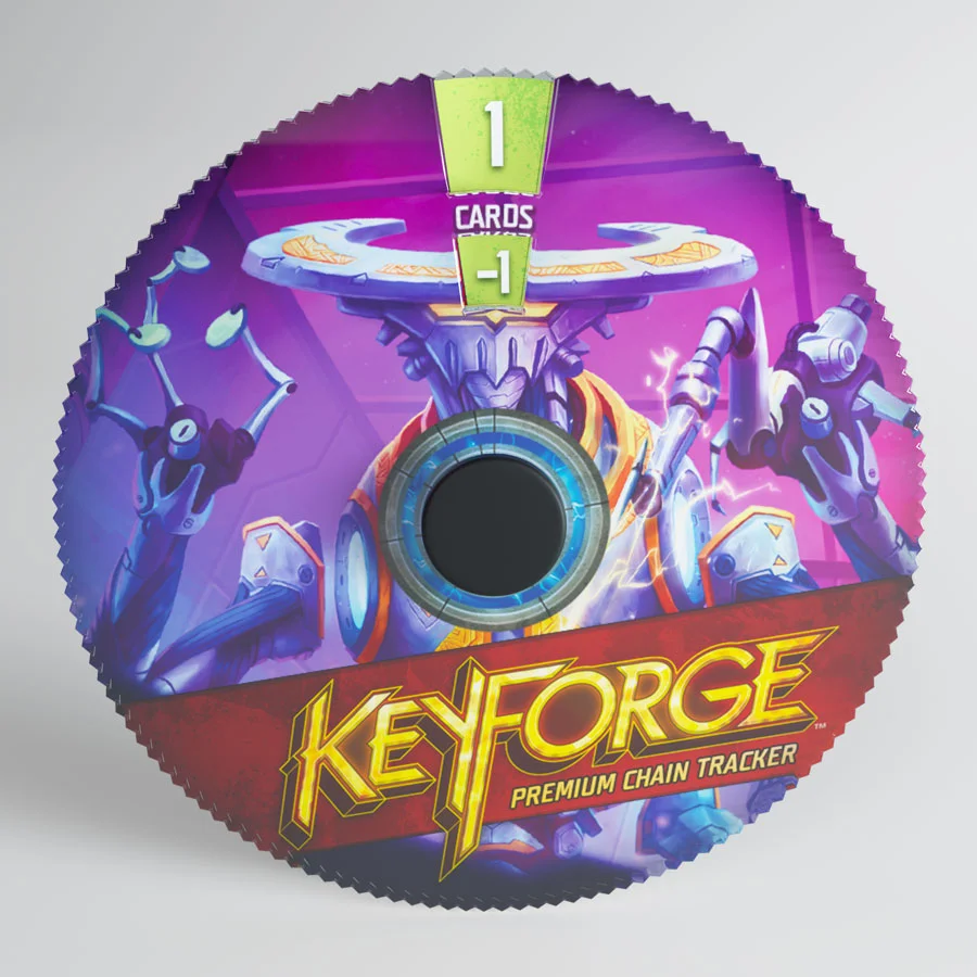 This KeyForge tournament-legal PREMIUM chain tracker – made out of premium printed acrylic – displays all current chains and the according limitations that they impose on card draw. The mechanical adjustment prevents accidental alteration. Coming in 7 different art styles (one for each of the game‘s first 7 houses), it fits perfectly in the accessories drawer of the KeyForge VAULT or the KeyForge GEMINI Deck Box.
