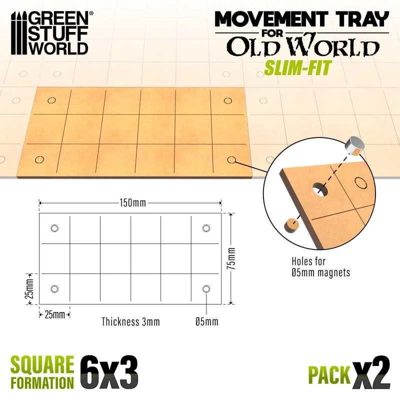 MDF movement trays are very popular among wargame and miniatures game enthusiasts as they provide stability in the displacement of troops, customization by unifying the formations of the units of your armies, in addition to their great compatibility with a multitude of game systems. They serve as a solid base for assembling, transporting, and displaying your wargame figures, enhancing both the gaming experience and the visual aesthetics of the battlefield. They help maintain a level playing field and accurately measure distances and unit displacements. This set is made of MDF wood and laser-cut with high precision.