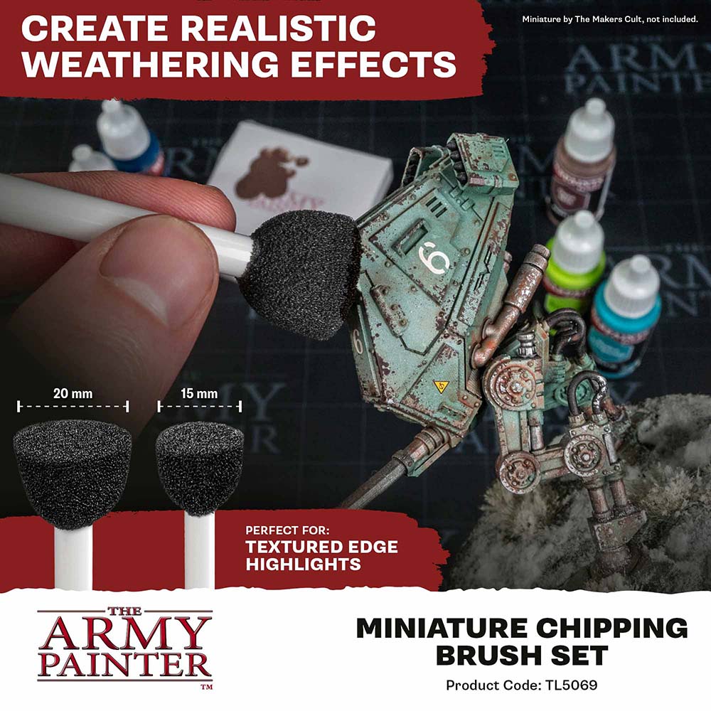 Add convincing wear and tear to small models. Precision foam tips make it easy to place fine scratches, edge wear, and clustered chips with repeatable control. Ideal for armour plates, weapons, helmets, and compact panels.