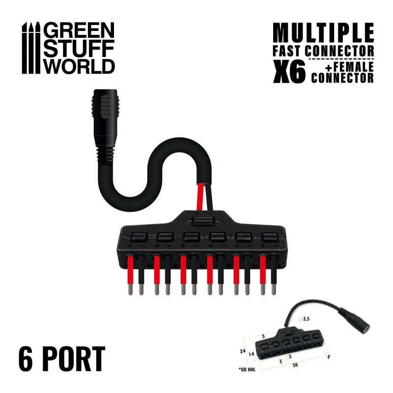 These 6-port multiple fast connectors are ideal for installing LEDs in your models and dioramas without the need for complex soldering. With these, you can make connections quickly and easily, and they're also perfect for led lights. Installation is quick and easy, so you'll be up and running in no time. Includes: 1 complete set of 6-ports Fast connector + 1x jack cable * This set needs a little assembly before use.
