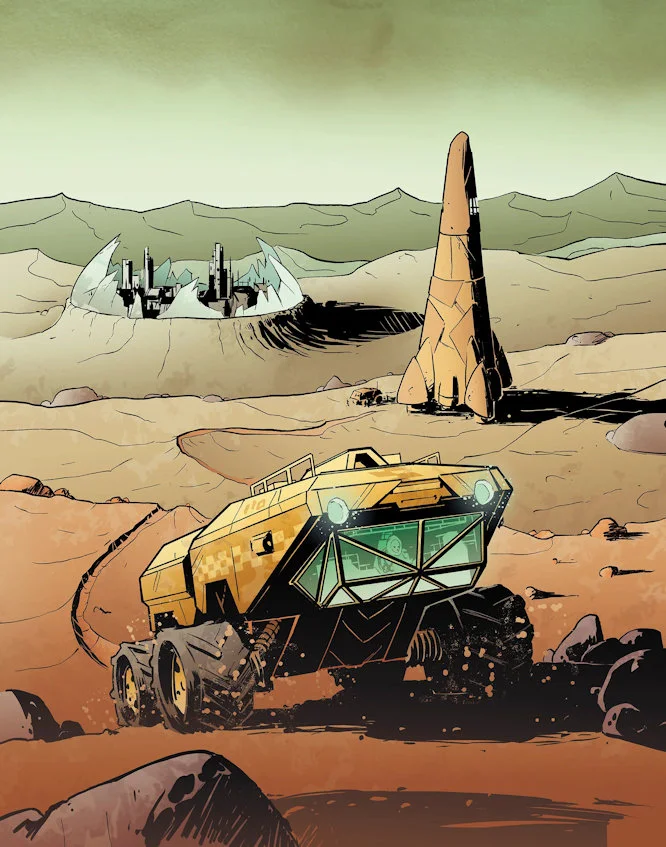 Genom rymdkapselns små tittgluggar ser ni staden där den hänger tyngdlös under stjärnorna, obekymrat massiv, spretigt glänsande. Ett myller av metallformer, förbundna av rör och vajrar, som en enorm mobil hängandes över Jorden, mänsklighetens förgiftade vagga. Kapselns styrraketer knuffar er framåt genom labyrinten av stag och lejdare. När ni kommer närmre ser ni att allt inte verkar stå rätt till med denna stjärnstad. Ni flyter förbi stora hål, sönderslitna vajrar och spruckna paraboler.