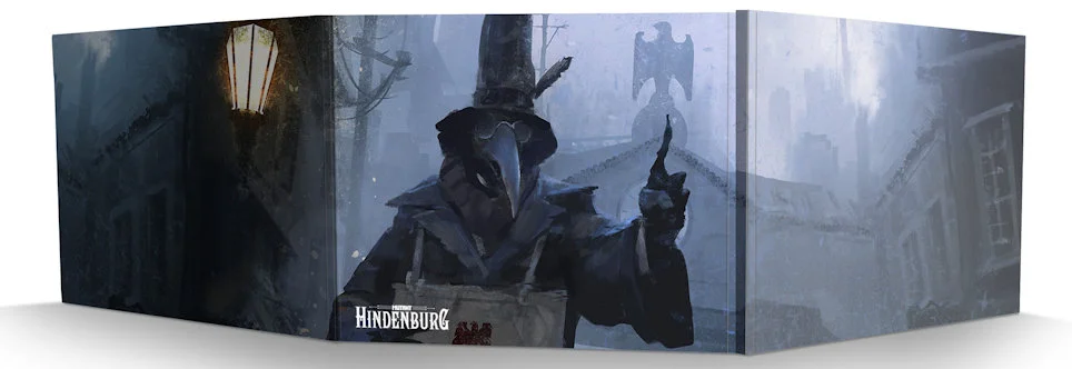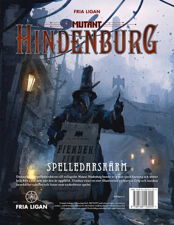 Denna lyxiga spelledarskärm till rollspelet Mutant: Hindenburg består av 3 mm tjock kartong och mäter hela 855 x 216 mm när den är uppfälld. Utsidan visar en stor illustration av Martin Grip och insidan innehåller tabeller och listor som underlättar spelet.