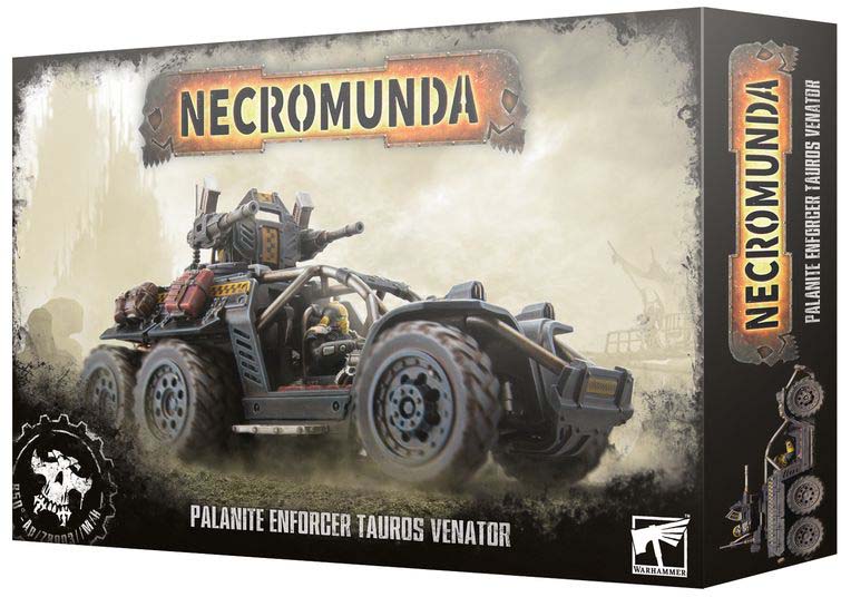 The Tauros Venator is an all-terrain patrol vehicle used by the Palanite Enforcers as a rapid response interceptor across the ash wastes of Necromunda. These tough and highly mobile vehicles are vital for policing the strategic ridgeways of the wastelands, protecting merchant convoys and law-abiding travellers while delivering brutal justice to outlaws.