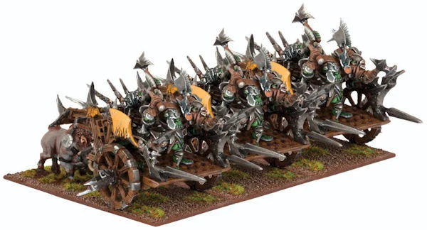 Orcs often mimic the ideas of the other races when constructing weapons and war machines, but often they will add their own unique take to deliver something different. Thus are born contraptions such as the fight wagon. Whereas a chariot can hit hard and fast, aiming to smash a hole in the weak point of an enemy line, a Fight Wagon take a slower approach, driving a group of Morax towards the foe on a raised and spiked platform, their axes threshing a path through densely packed infantry and cavalry. There is never a shortage of Morax volunteers to serve on Fight wagons, and any who face them will not soon forget the experience – in the unlikely event that they live.