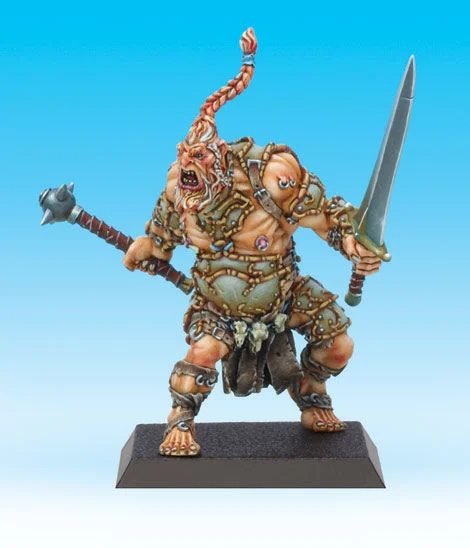 Though the Sessairs were quick and strong, the goblins were much more numerous. For every one of them that fell in combat, two took his place. The Kelts were being cruelly chopped up by dozens of small blades. Emptied of their blood, their warriors were sinking into the green tide. A son of Ogmios suddenly freed himself from a neighboring fray, the freshly cut head of a troll hanging from his belt. He shouted at his brothers to throw themselves forward. His weapon was raised and came down again and again, making little blood-splattered corpses fly in all directions. The sons of Ogmios, the descendants of the legendary chief of the Ogmanans, are giant barbarians mounted on a Creature base (3.75 cm x 3.75 cm). Endowed with MOV 15, ATT/STR 6/11 and very aggressive abilities such as War fury, Hard-boiled and Implacable/1, they admirably give support to the Sessairs by providing them with impressive strike force. Son of Ogmios Rank: Kelt Elite 55 A.P.