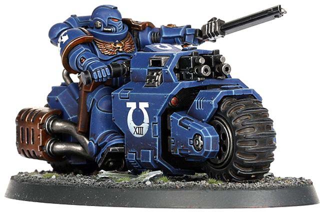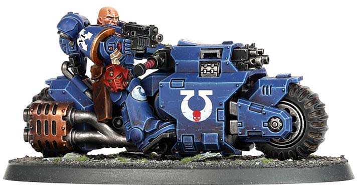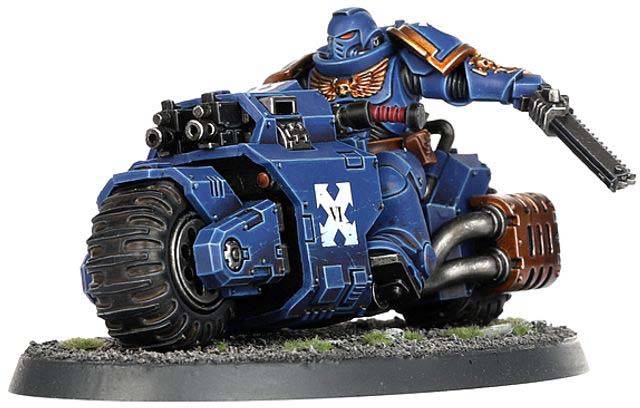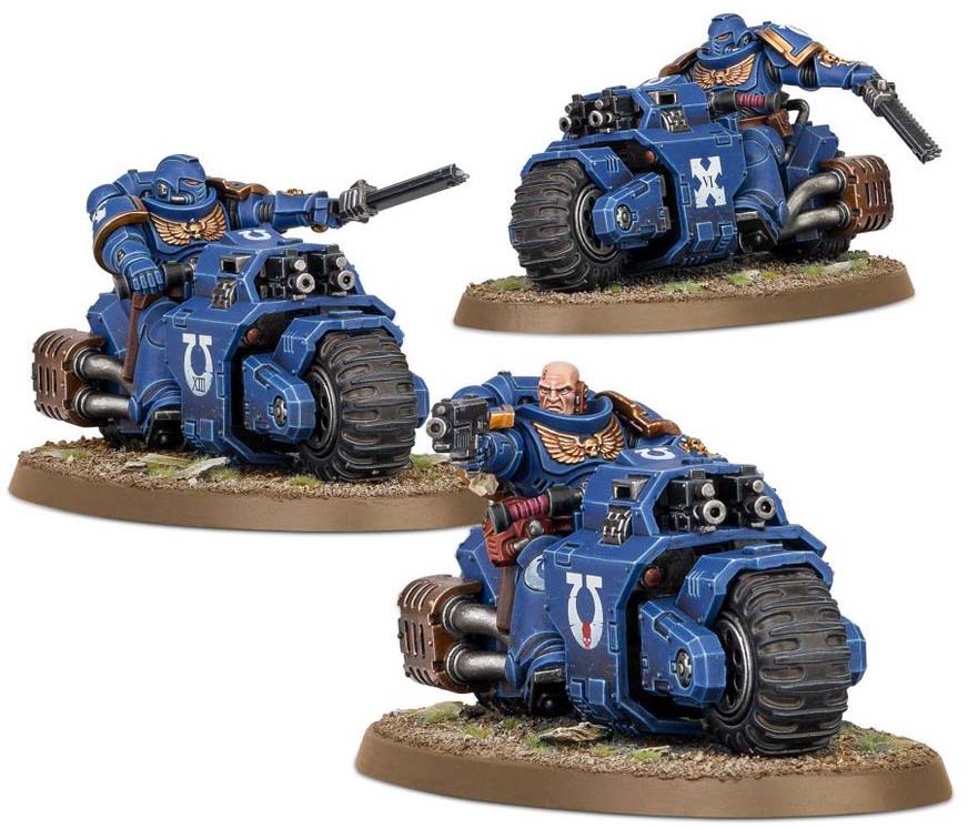 Outrider Squads operate ahead of the main Space Marines force, guarding flanks and hunting down enemy infiltrators. These fast attack bikers strike quickly, hitting vulnerable targets and withdrawing before the enemy can respond.