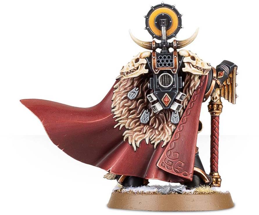 Armed with a crozius arcanum and bearing the Wolf Helm of Russ, he inspires his warriors while charging into the thick of battle.