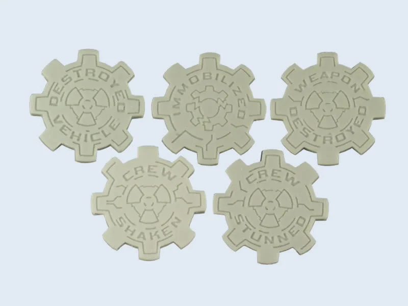 Set of 5 unpainted Status Markers. Each set contain : Weapon Destroyed Marker Crew Shaken Marker Crew Stunned Marker Destroyed Wehicle Marker Immobilized Marker Created by Sebastian Makowski