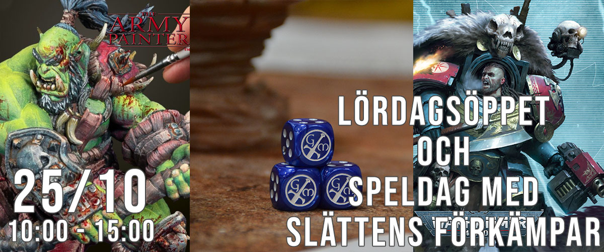 Lördag den 25:e Oktober 10-15 har vi extra öppet i butiken och spelföreningen Slättens Förkämpar är på plats för att visa dig hur man spelar figurspel. Vi kommer även ha ett målarbord redo för de som vill måla och pyssla.