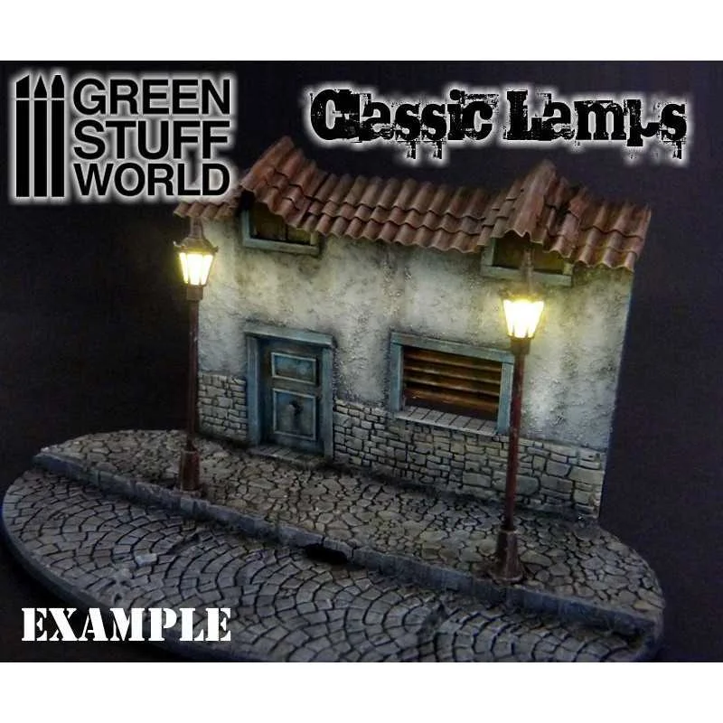 Fully Assembled Classic Street Lamps made of black hard plastic with wire and resistor for Plug and Play use. You may Connect them to any power source between 3V to 18V(3V dim light,12V bright light). These lamps will specially look great with 9-12 Volts of power input. If you are not good at electricity, you may just use them without switch them on ;) Resistor: 1.5kOhm,1/4W Length of the wires: 15cm+15cm Best scale: 28mm Alternative valid scales: 25-54mm Total height: 8,5cm Content: 10 classic street lamps with lights TRICKS: - Use a lighter for stripping the wires When required. Do not expose too long to fire, or the Entire led will burn. - Use brass rods or tubes to conduct the electricity.