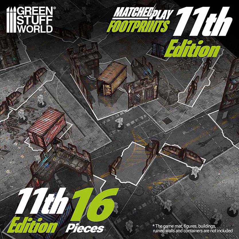Dessa footprint-mallar för Warhammer 40,000 används för att tydligt markera terrängzoner som ruiner, byggnader och väggar på spelbordet.