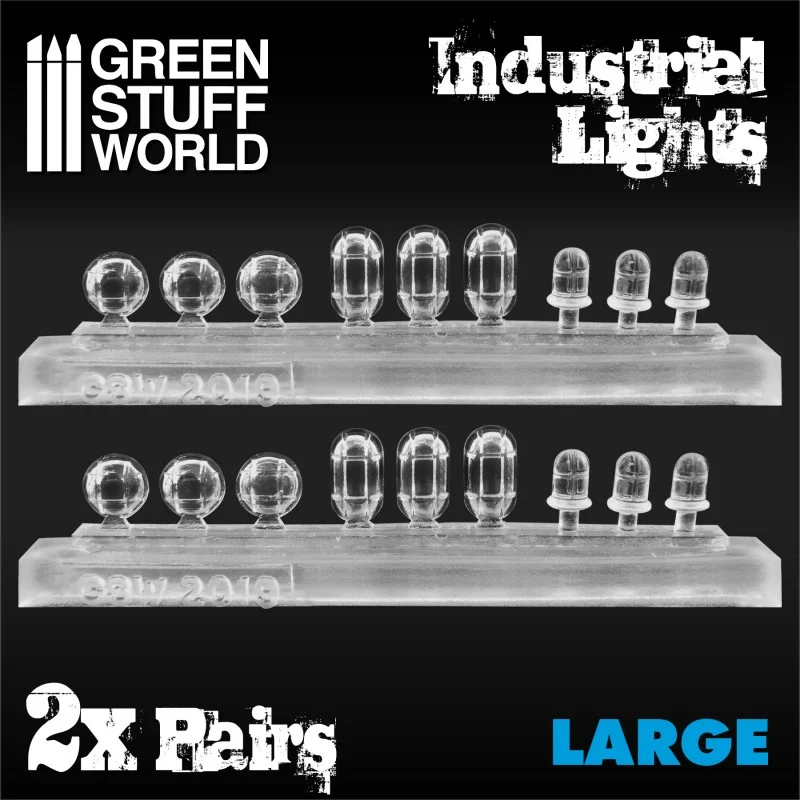 Two plaques containing 9 transparent resin industrial grilled lamps each. You can choose from 3 types to best suit your needs, whether for a diorama or for adding headlights to a vehicle. They have space inside to insert real LED lights. This product comes unpainted and it is perfect for 25-28-32-54mm miniatures. Each set contains 18 resin Industrial Lights.