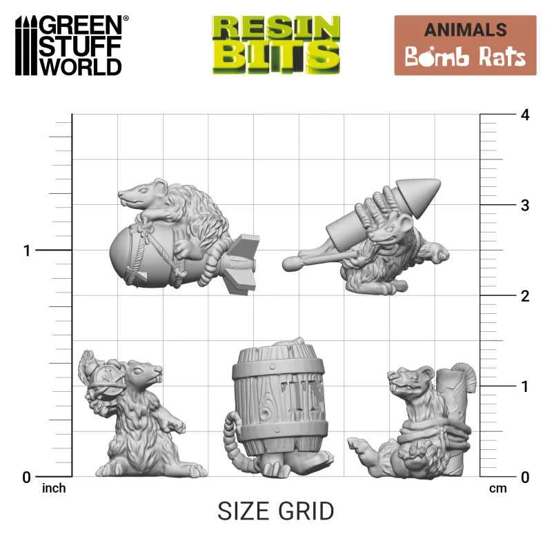 Give your bases, dioramas, and miniatures a realistic touch with these Top-Quality Resin Bomb Rats! Carefully designed in different shapes and sizes to suit 1/48-1/35 scales (28mm-54mm). This product comes unpainted. Each set contains 12x bomb rats.