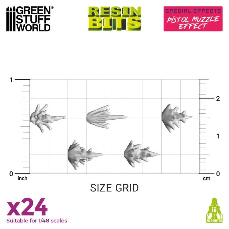 Made from high quality materials, our resin bits are durable and easy to attach to your miniatures and dioramas. Their transparency and shine ensure that your creations stand out and capture the attention of all onlookers. Don't underestimate the power of resin bits to transform your modelling projects! Take your miniatures and dioramas to the next level with the energy and dynamism of our resin items. Explore our collection today and discover how you can take your creations to new heights of creativity and realism. These products are delivered unpainted and are ideal for 28-35-54mm miniatures (1:48 - 1:35 scale). Each set includes 24 x Pistol Muzzle Flash