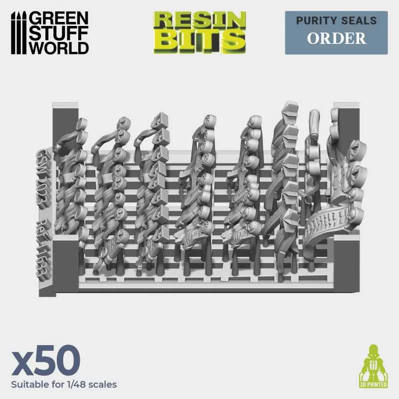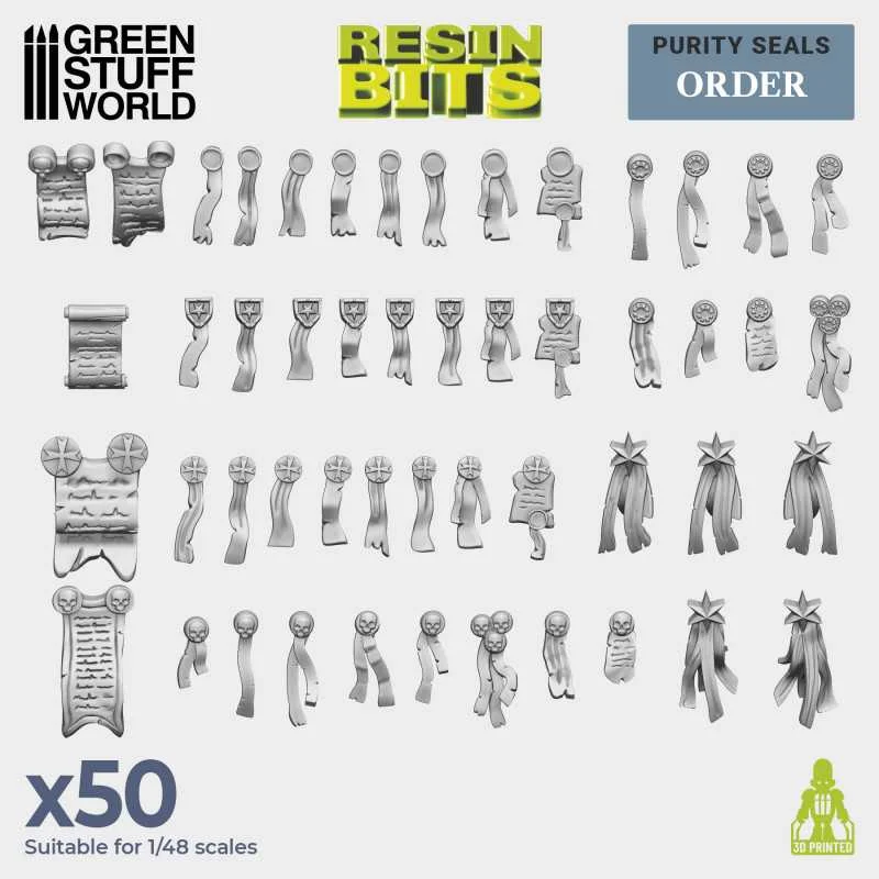 Purity seals are a popular decorative element in Warhammer 40K modeling carefully designed to add a sense of authenticity and character to miniatures. These seals are small scrolls or ribbons that attach to the armor or weapons of a miniature and are often adorned with various symbols and inscriptions. They come in different shapes and sizes to suit all needs and scales. Ideal for dioramas and scenery. This product comes unpainted and is perfect for 1:48. Contains: x50 purity seals