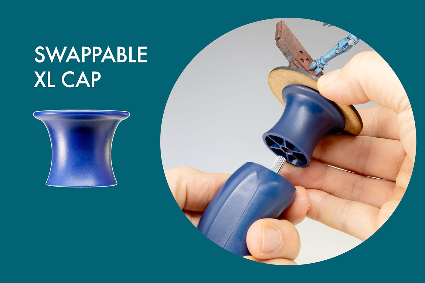 4 XL swappable large caps for the RGG360° miniature holder V2. Swap your miniatures at will, without touching them. Speed up your batch painting. In response to popular demand from our community, we’ve designed the new XL cap, which is curvier, longer, and larger. This innovation allows you to comfortably hold larger miniatures and provides a longer cap option, ideal for those with bigger hands.
