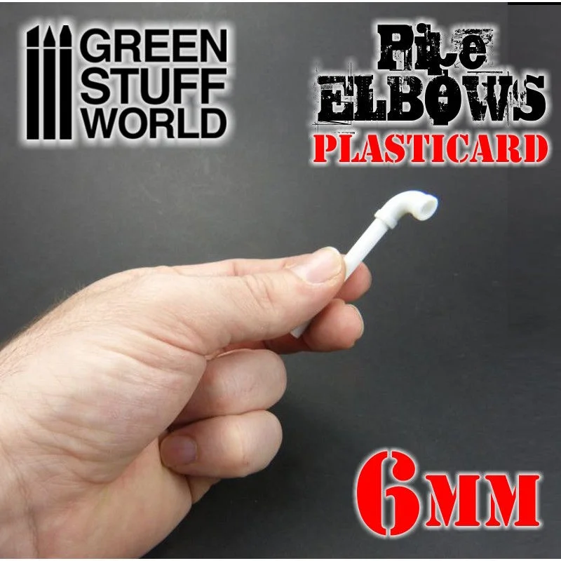 Plasticard elbows made of HIPS plastic (Polystyrene) known as Plasticard too. Material: Polystyrene Thickness: 6mm diameter Inner hole: 5mm diameter This set includes 20 elbows