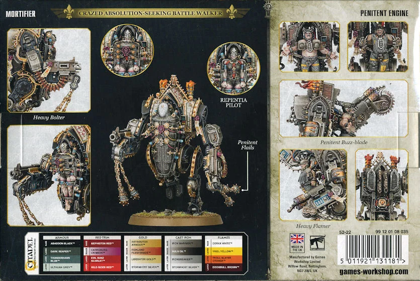 This kit can be built as two Penitent Engines equipped with a pair of heavy flamers and a choice of penitent buzz-saws or penitent flails. Alternatively, any Penitent Engine can be assembled as a Mortifier, or as a fully-encased Anchorite, which are equipped with heavy bolters instead of heavy flamers.