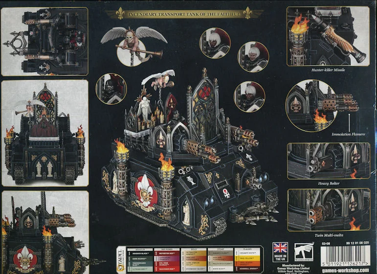 The Immolator is equipped with a hull-mounted heavy bolter and can be assembled with a choice of three main armaments on its turret – Immolation flamers, twin heavy bolters or twin multi-meltas. It can also equipped with an optional hunter-killer missile.