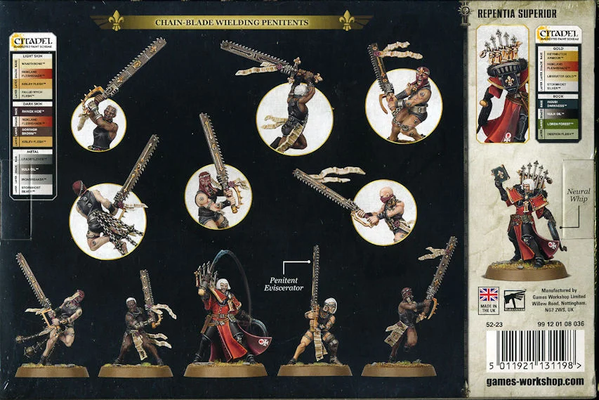 This kit builds nine Repentia armed with penitent eviscerators. Each body has a choice of two sets of arms for added variety. The Repentia Superior wields a pair of neural whips – one coiled and the other mid-lash – though one can instead be swapped for a holy tome. Repentia Superior can also be assembled with a choice of two heads (either with or without helmet).