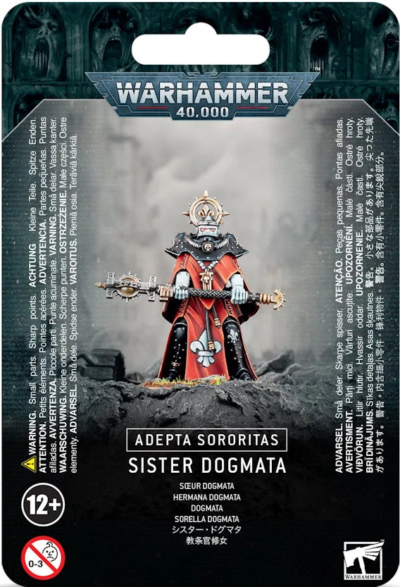 The kit is comprised of 15 plastic components, with which you can assemble one Sister Dogmata, and is supplied with 1x Citadel 32mm Round Base.