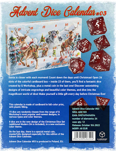 - On the last day, there is a special metal coin, masterfully designed, especially for this edition of the Advent Dice Calendar. (the quality of the coin is astonishing - one of the most detailed we ever created)