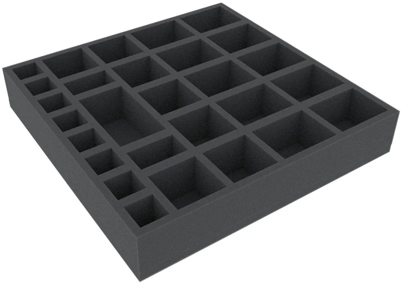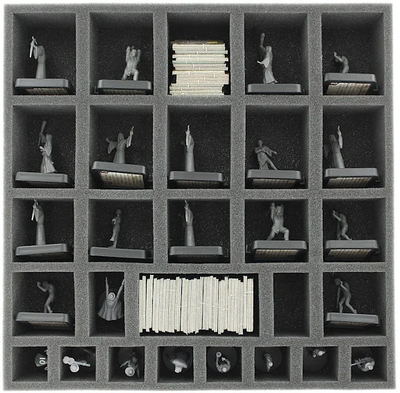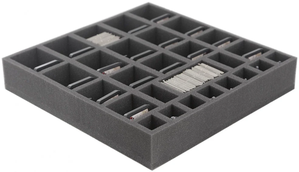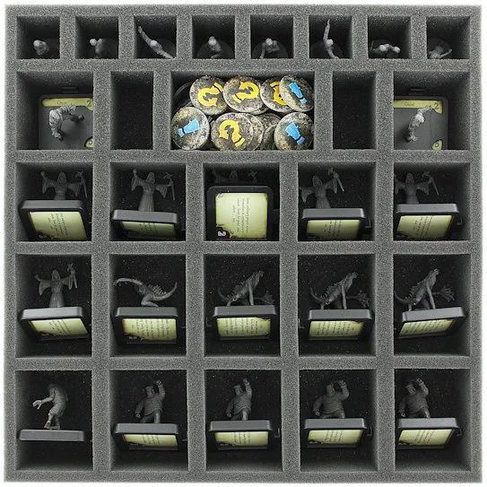 Foam tray especially for Mansions of Madness. The 28 different sized compartments are suitable for all conceivable game material like monsters, tokens or investigators.