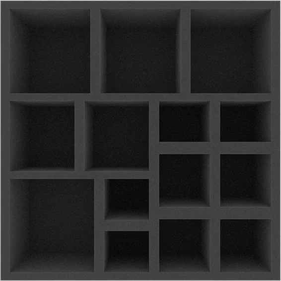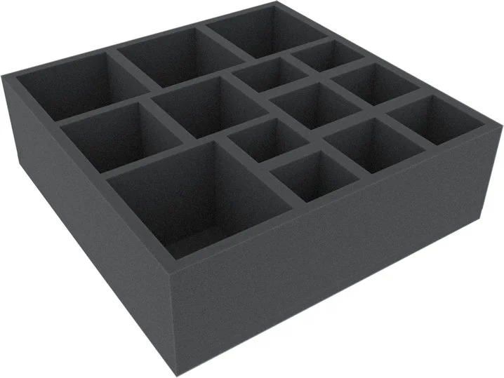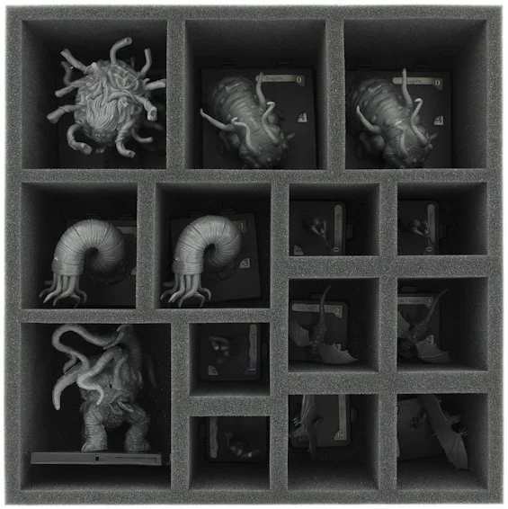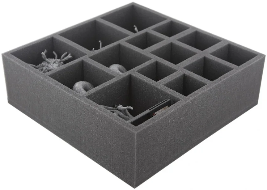 14 large cut-outs for the figures from the two expansions for Mansions of Madness Second Edition. The large miniatures of "Recurring Nightmares" and "Suppressed Memories" fit into the foam tray. The foam insert fits perfectly into the original board game box, or into the Feldherr box LBBG.