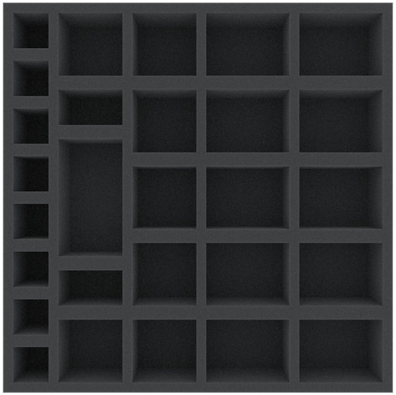 Foam tray with 28 slots for many original board game boxes. The 28 different slots own yourself for everything imaginable game material.