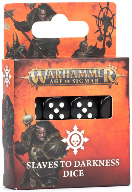 Each 16mm cubed dice with rounded edges is cast in black. The markings are picked out in white, and the '6' face bears the icon of the Slaves to Darkness.