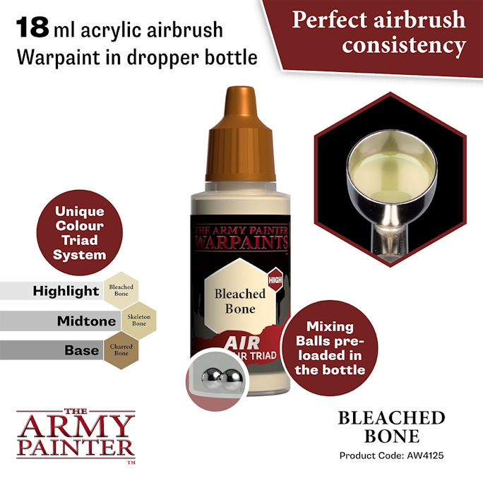 The Warpaints Air paints are of unparalleled quality due to the nature of the high coverage offered by the specially chosen and ultra-filtered vibrant pigments. This, combined with a very stable and matchless resin solution, is paint science at its best! To make things easier Warpaints Air comes pre-loaded with two steel Mixing Balls.