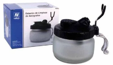 Airbrush cleaning pot, glass with plastic lid used to spray-clean airbrush. The airbrush is inserted into the opening of the plastic lid and is cleaned by spraying Vallejo Airbrush cleaner (71009) or water into the container. The air coming through the filter will be clean, and the waste water remains in the glass container. The airbrush cleaning pot will keep the workplace free from impurities during the cleaning of the airbrush. Contents: -Airbrush hanger -3x filter -Support -250 ml glass pot.