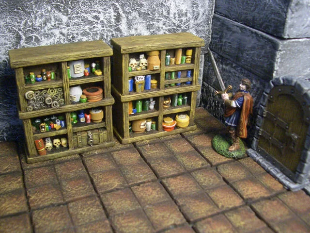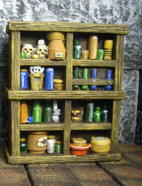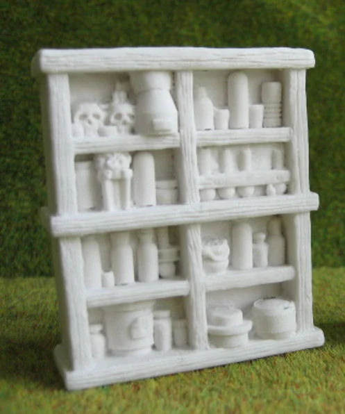 "The Alchemist shelf suitable for both in a dungeon, as well as a decoration in a building, room or a diorama. The shelf is molded from high-quality resin and comes unpainted. The rack convinces with its numerous contents.