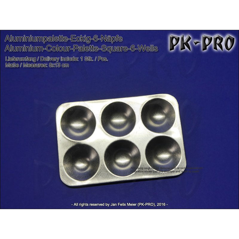 Square palette made out of aluminium with 6 round wells. Dimensions: 8,0 x 13,0 cm.