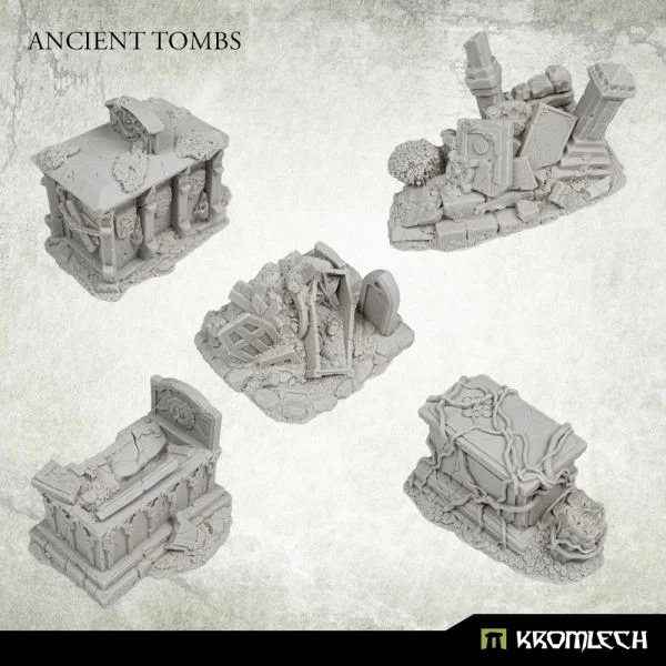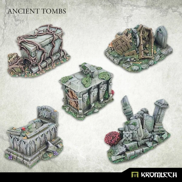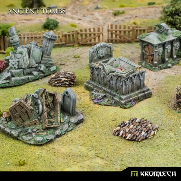 This set contains five grim, stone grave terrain pieces to recreate fantasy burial sites or upgrade your cemetery board, among many other options. Designed to fit fantasy 28mm heroic scale wargaming. Supplied unassembled and unpainted. Please note that models seen in pictures are not part of this set.