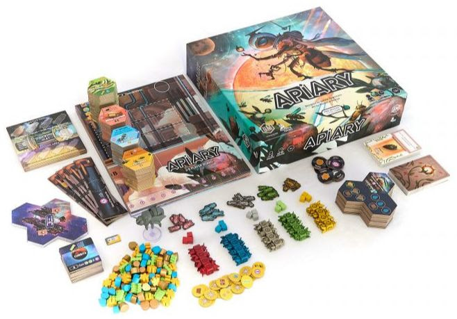 In Apiary, each player controls 1 of 20 unique factions. Your faction starts the game with a hive, a few resources, and worker bees. A worker-placement, hivebuilding challenge awaits you: explore planets, gather resources, develop technologies, and create carvings to demonstrate your faction’s strengths (measured in victory points) over one year’s Flow. However, the Dearth quickly approaches, and your workers can only take a few actions–with benefits increasing relative to worker strength, culminating in powerful strength-4 bonuses–before they must hibernate!