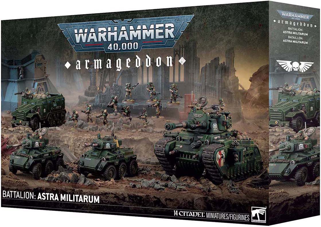 Armageddon Battalion: Astra Militarum är en pansartung styrka med stridsvagnar, transport och infanteri för offensiv kontroll.