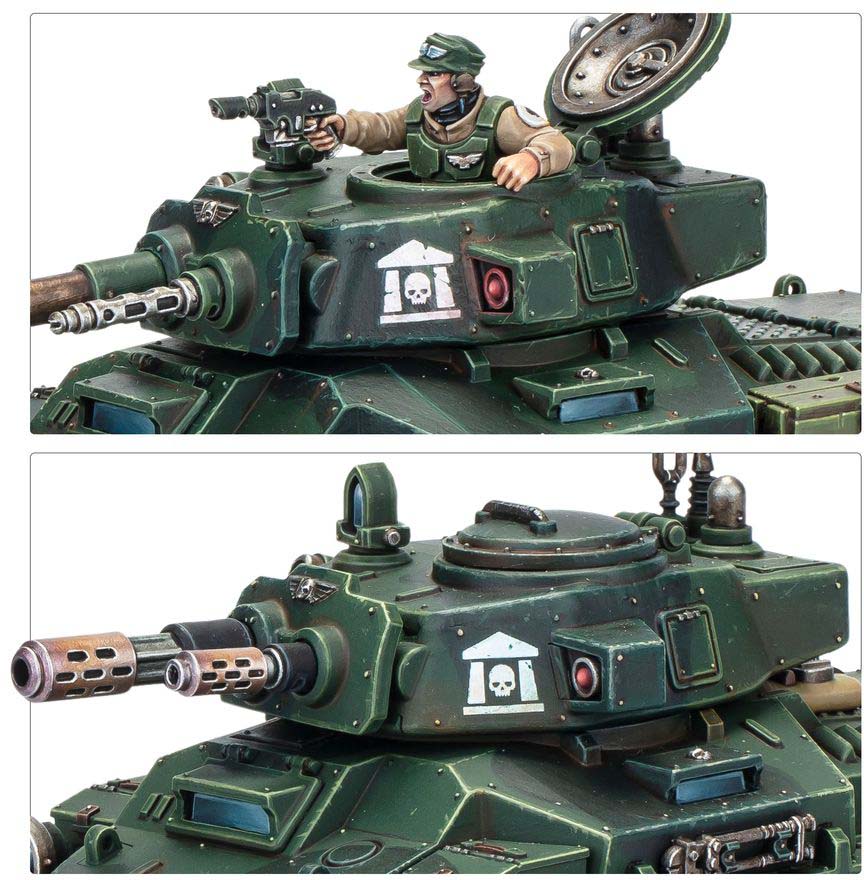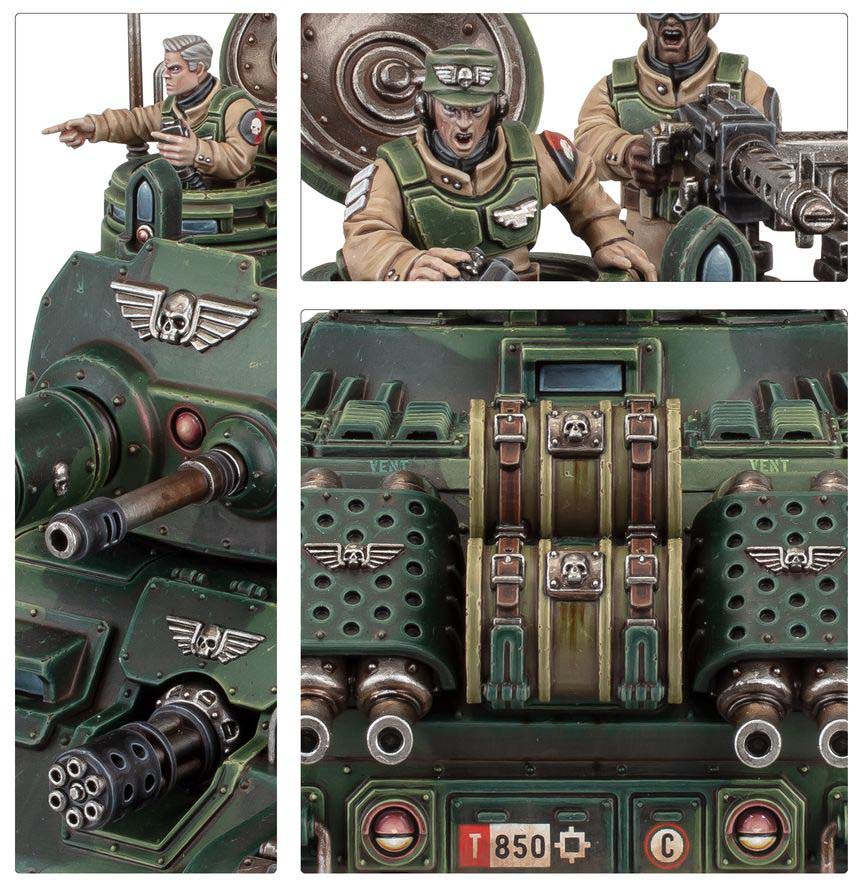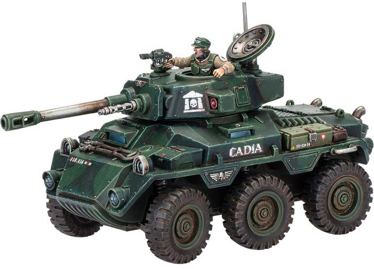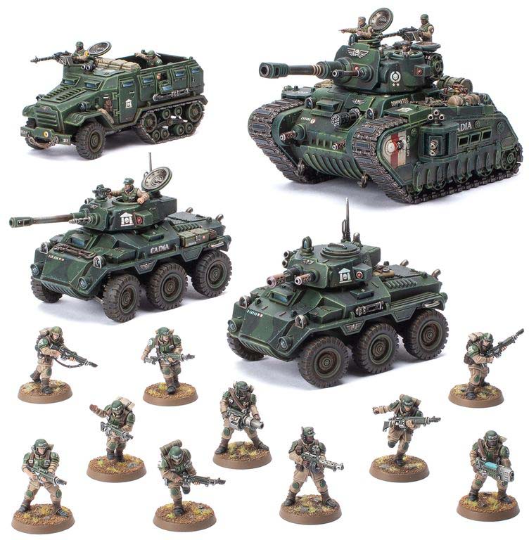 I spetsen står en mäktig Rogal Dorn Battle Tank, konstruerad för att slå ut även de mest motståndskraftiga målen. Den stöds av snabba Hippogriff AFVs som ger rörlighet och eldunderstöd, medan en Centaur RSV transporterar trupper dit de behövs som mest. På marken säkrar Cadian Shock Troops positioner och håller terräng.